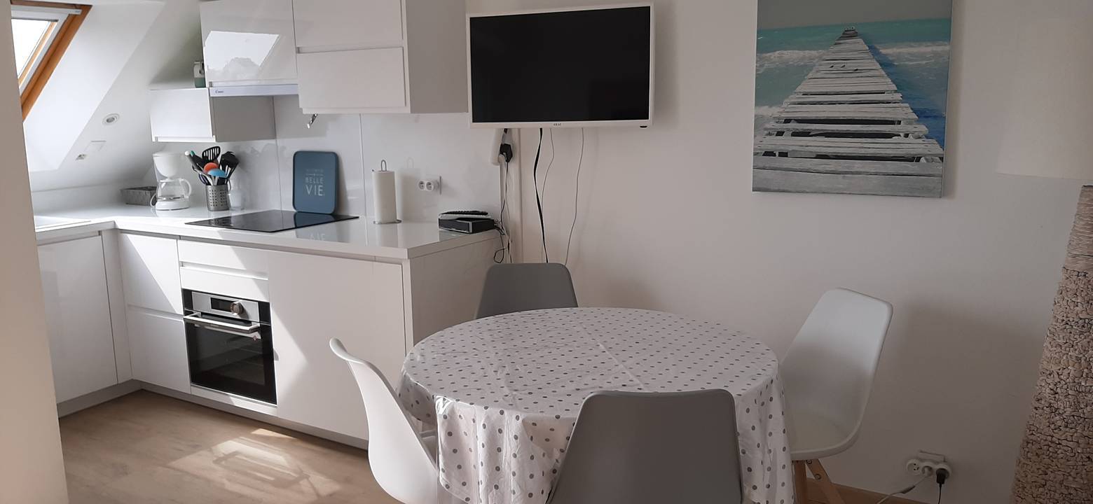 Equipement : four électrique, four micro-ondes, réfrigérateur, plaques à induction, télévision, cafetière électrique, salon de jardin.