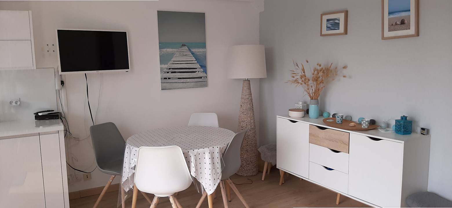 | Séjour Séjour donnant sur terrasse de 6M² 1 table + 4 chaises + 1 buffet + 1 lampe + 1 TV murale 1 banquette-lit BZ + 1 fauteuil 2 tablettes + lampes + miroir mural 1 baie vitrée avec vue route et vue mer depuis la terrasse | 14 | |