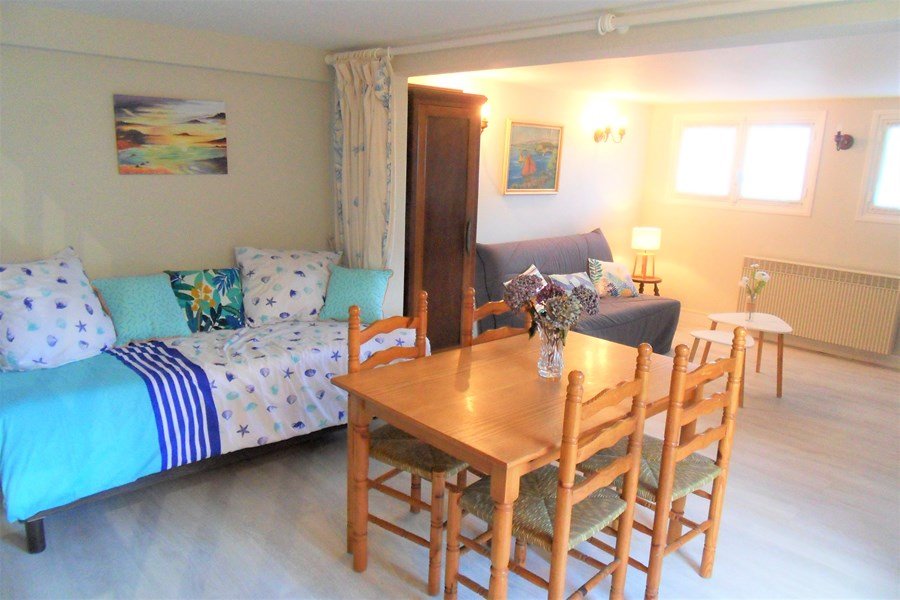 - Une pièce de vie avec un espace salon équipé d'une banquette BZ 2 personnes et un espace salle à manger disposant d'un lit simple 90 cm