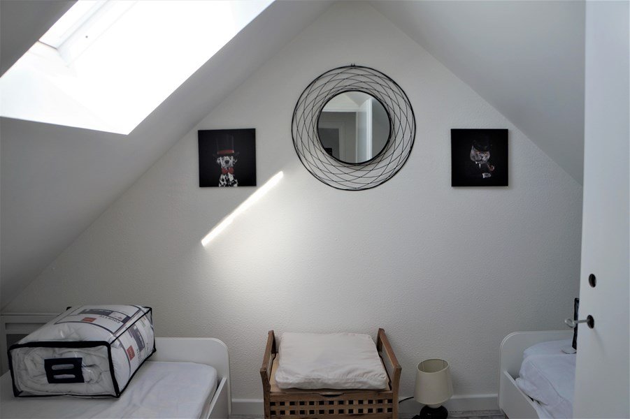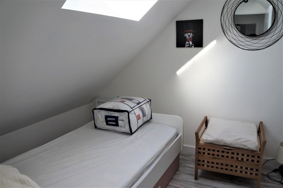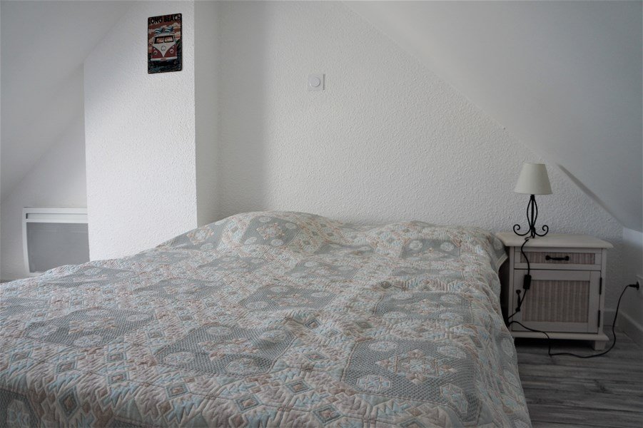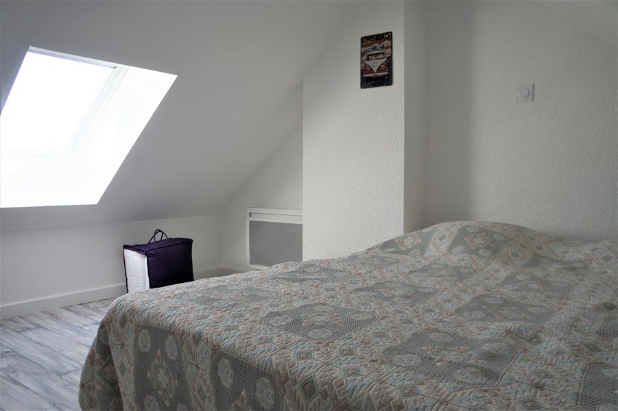 | Chambre 2 Surface au sol de 8 M². Chambre sous pente ( Loi carrez : 2.10 M²) Equipée de 2 lits 90 + chevets Vélux exposé Sud-Ouest Vue parking | 2 | Sud-Ouest |