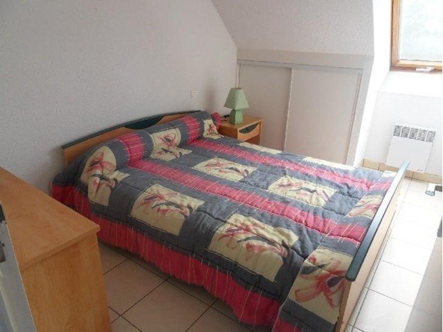 | Chambre 1 Chambre équipée d'un lit double 140 cm. 1 commode +1 table de chevet avec lampe Vélux exposé Nord-Ouest. Vue parking | 6 | Sud-Est |