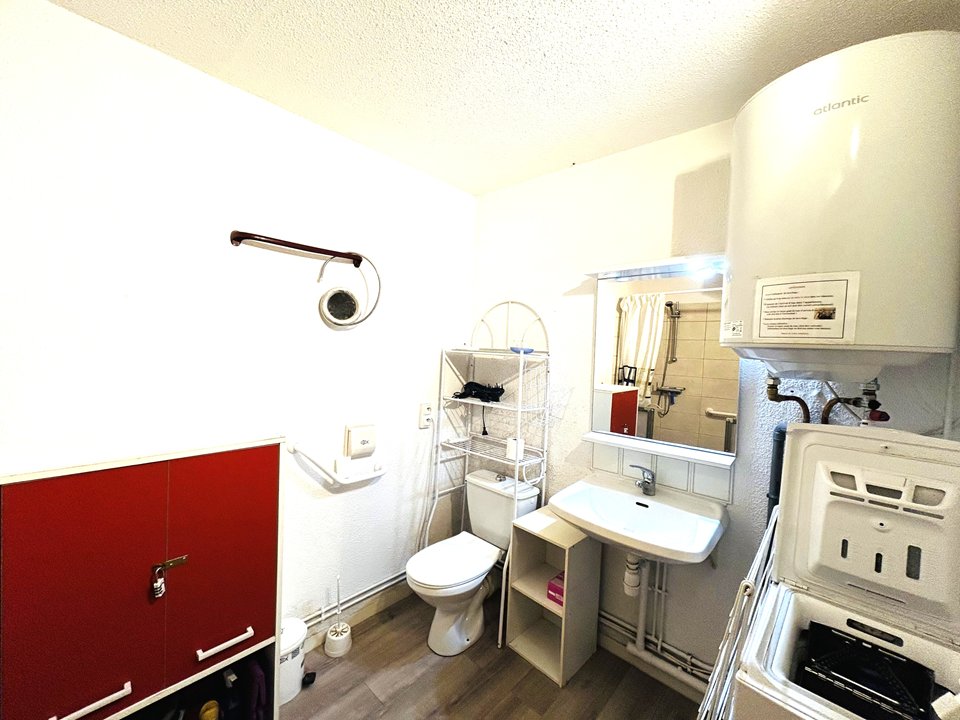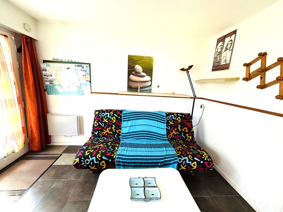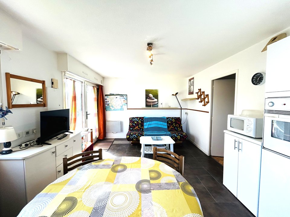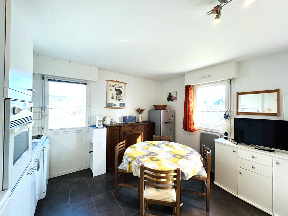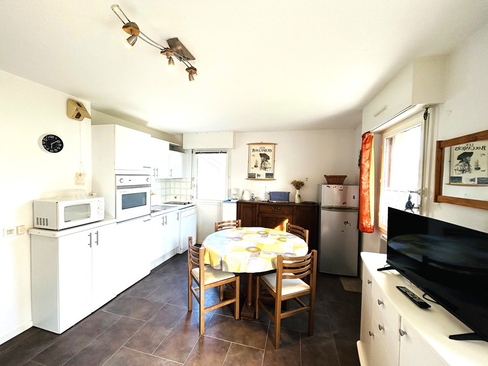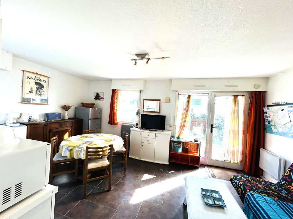 | Cuisine / séjour Cuisine ouverte sur pièce de vie principale. 1 table + 4 chaises + 1 buffet 1 banquette-lit + 1 table basse + 1 meuble avec télévision 1 porte-fenêtre donnant sur jardinet, orientée Sud-Ouest 1 fenêtre orient&ea | 20 | Sud-Ouest |