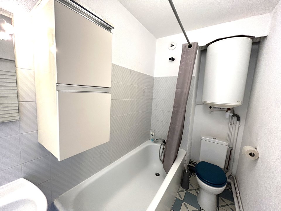 - Une salle de bain avec baignoire, vasque et WC.