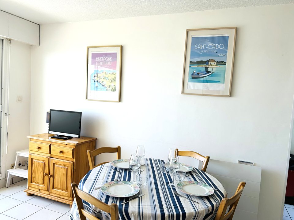 | Séjour/ Salon 1 table et 4 chaises 1 buffet + 1 meuble avec télévision 1 Canapé lit 140 1 Baie vitrée exposée Nord-Ouest, donnant sur terrasse Vue Mer | 13 | Nord-Ouest |