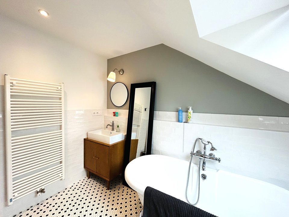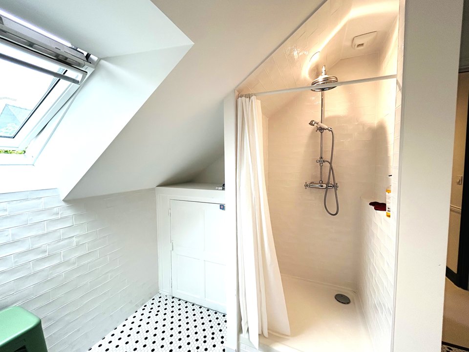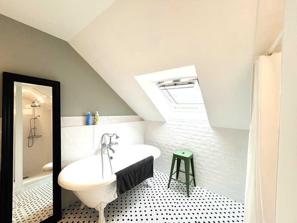 - Une salle de bain avec douche et baignoire