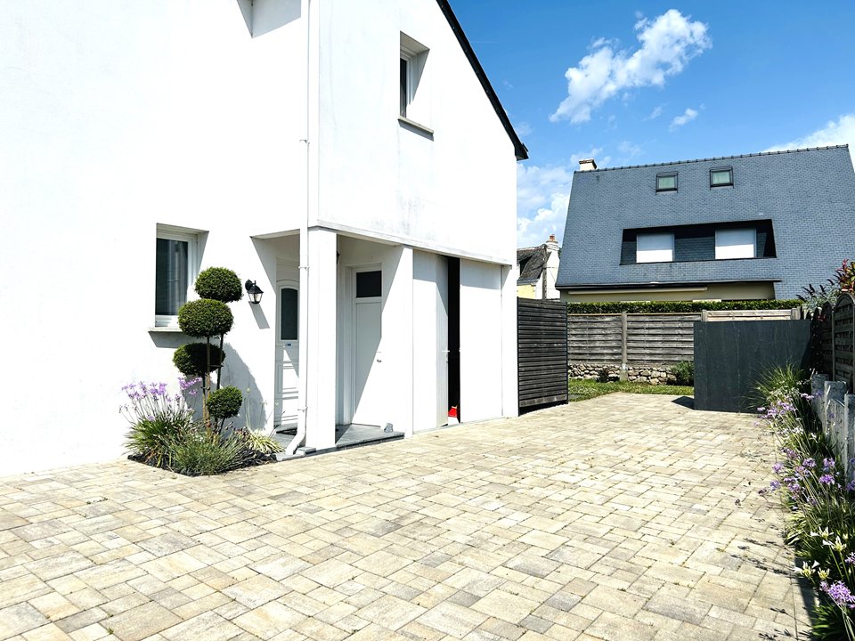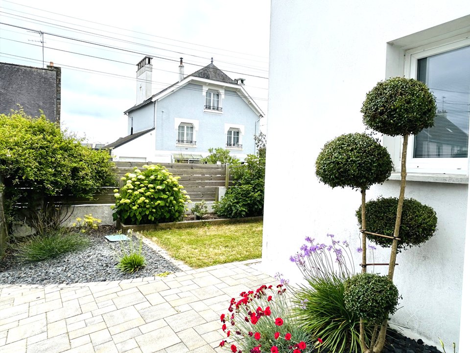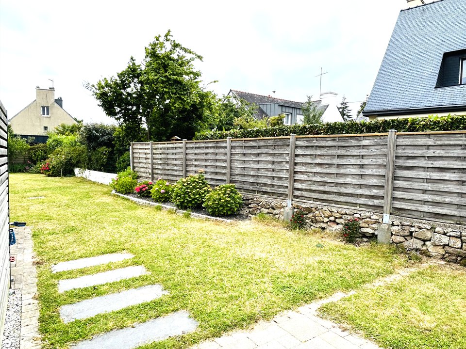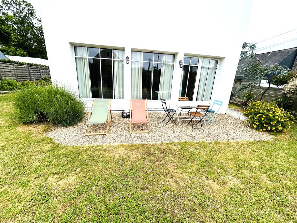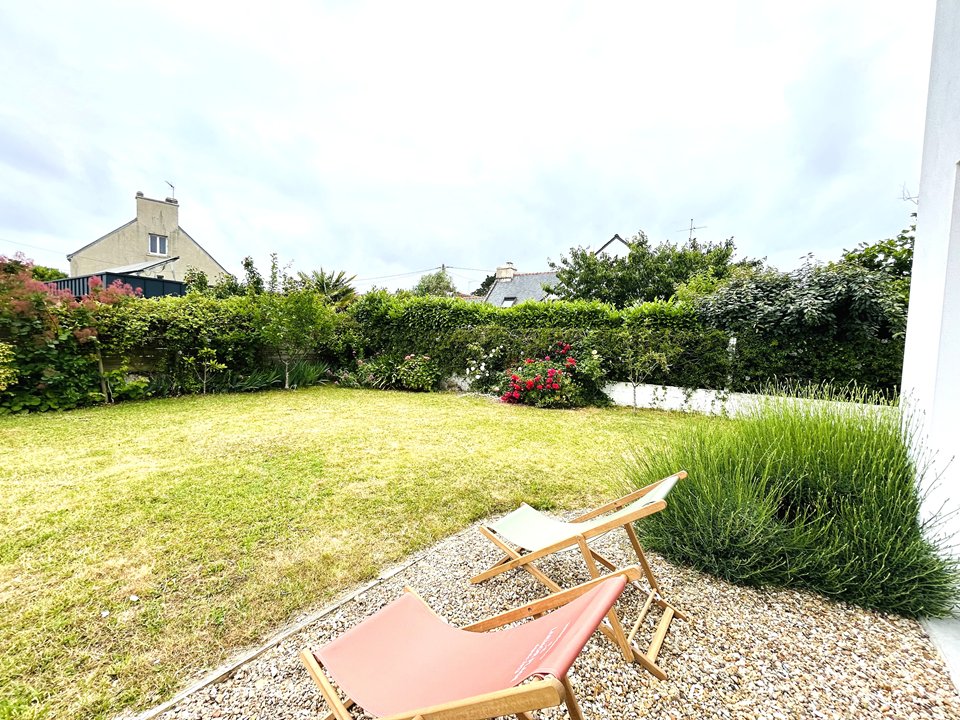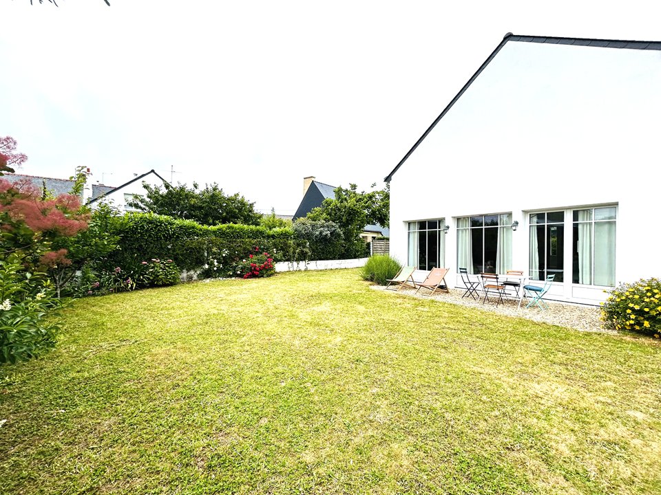 Elégante maison résidentielle de 150 m², située à Larmor-Plage à 500 m de la plage, avec agréable jardin clos et offrant un équipement complet.