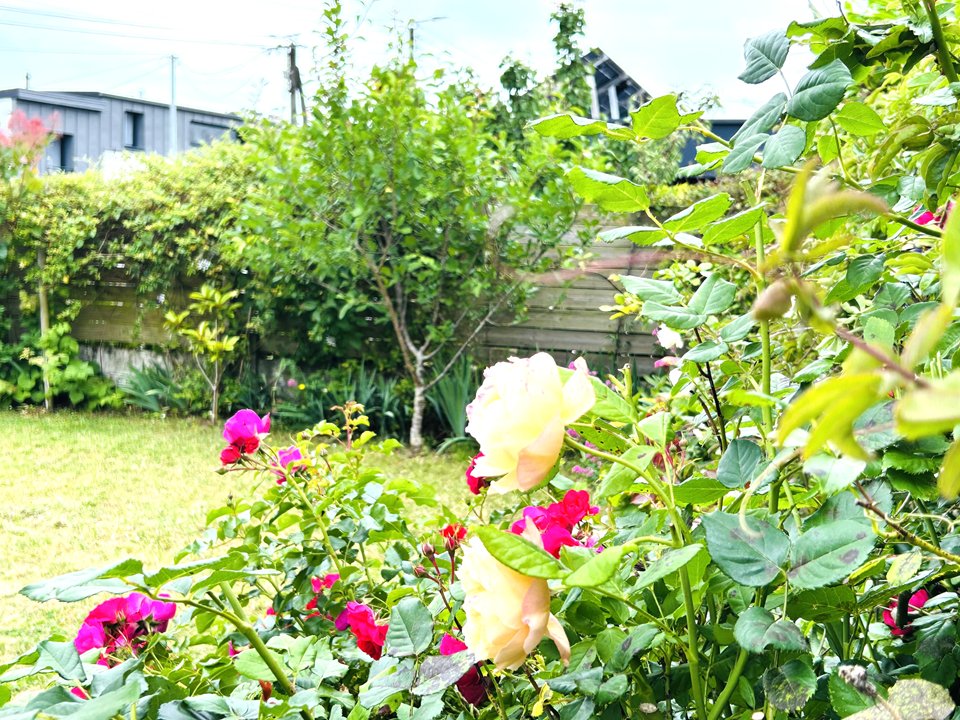 - Un beau jardin clôturé et arboré, avec terrasse à l'ouest et salon de jardin.