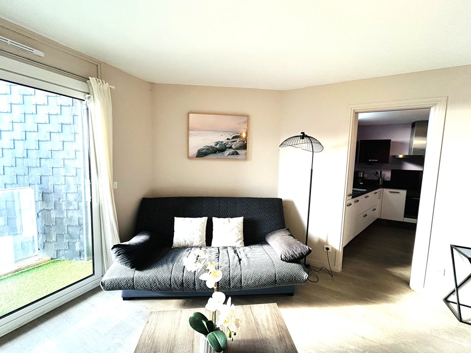 - Un séjour salon vue mer avec cuisine toute équipée ouverte, équipé d'une table et d'un canapé lit