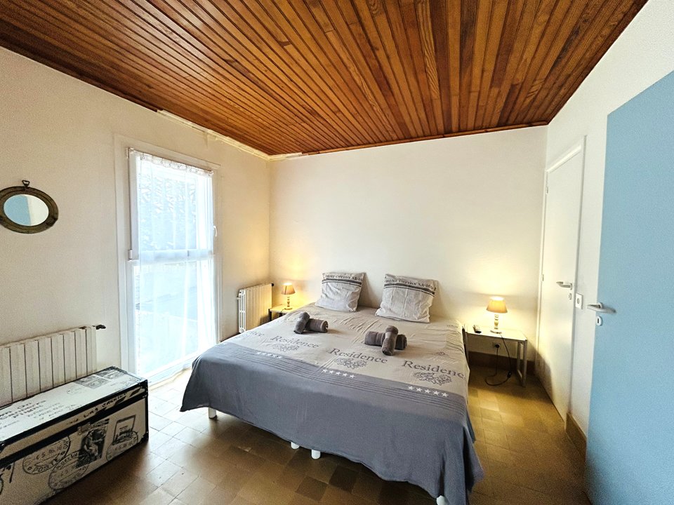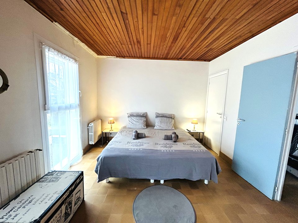 | Chambre 3 1 lit double 130 cm + 2 chevets avec lampes 1 fauteuil 1 placard Porte-fenêtre ouvrant sur terrasse avec pleine vue mer | 11 | Sud-Ouest |