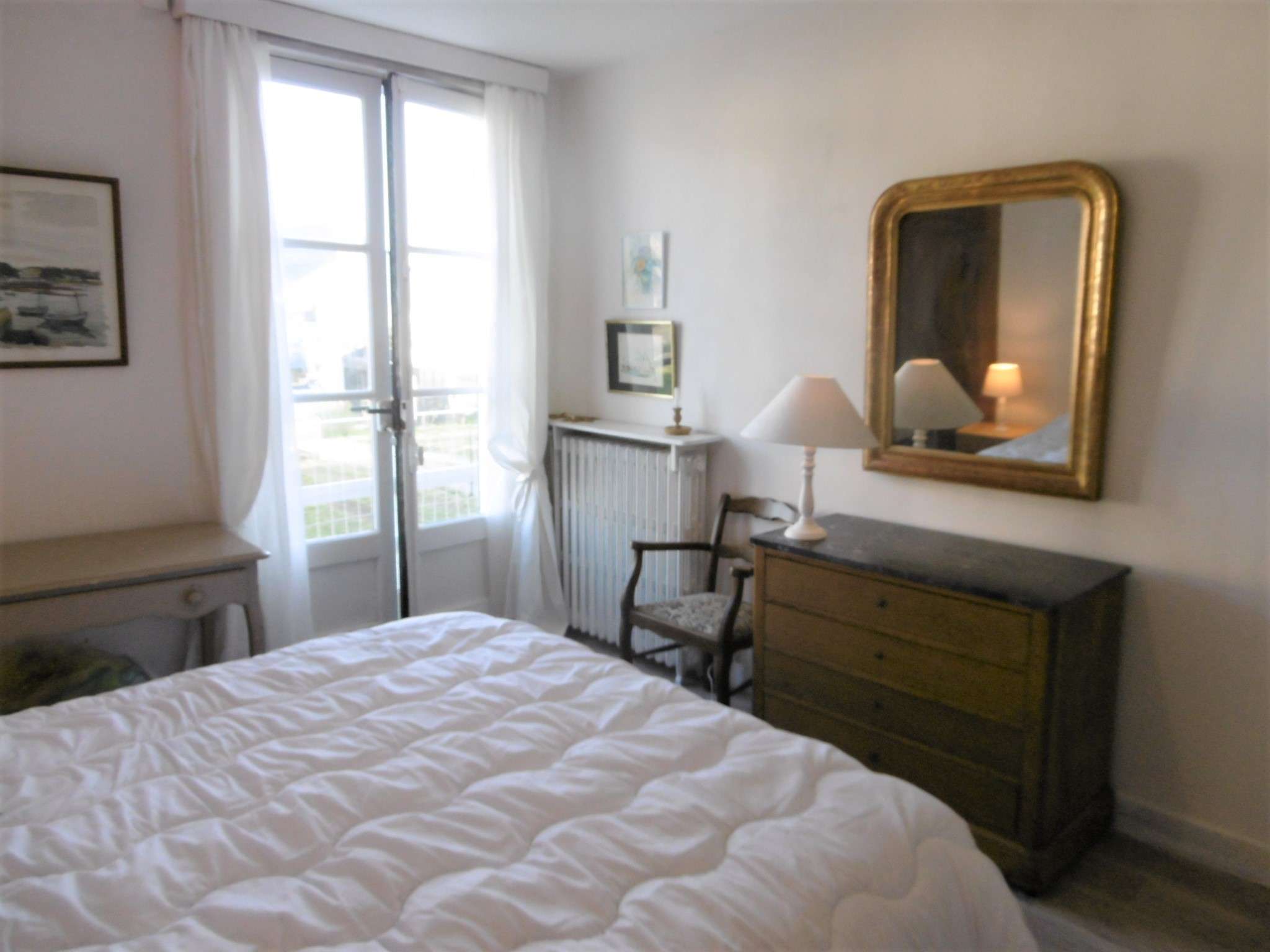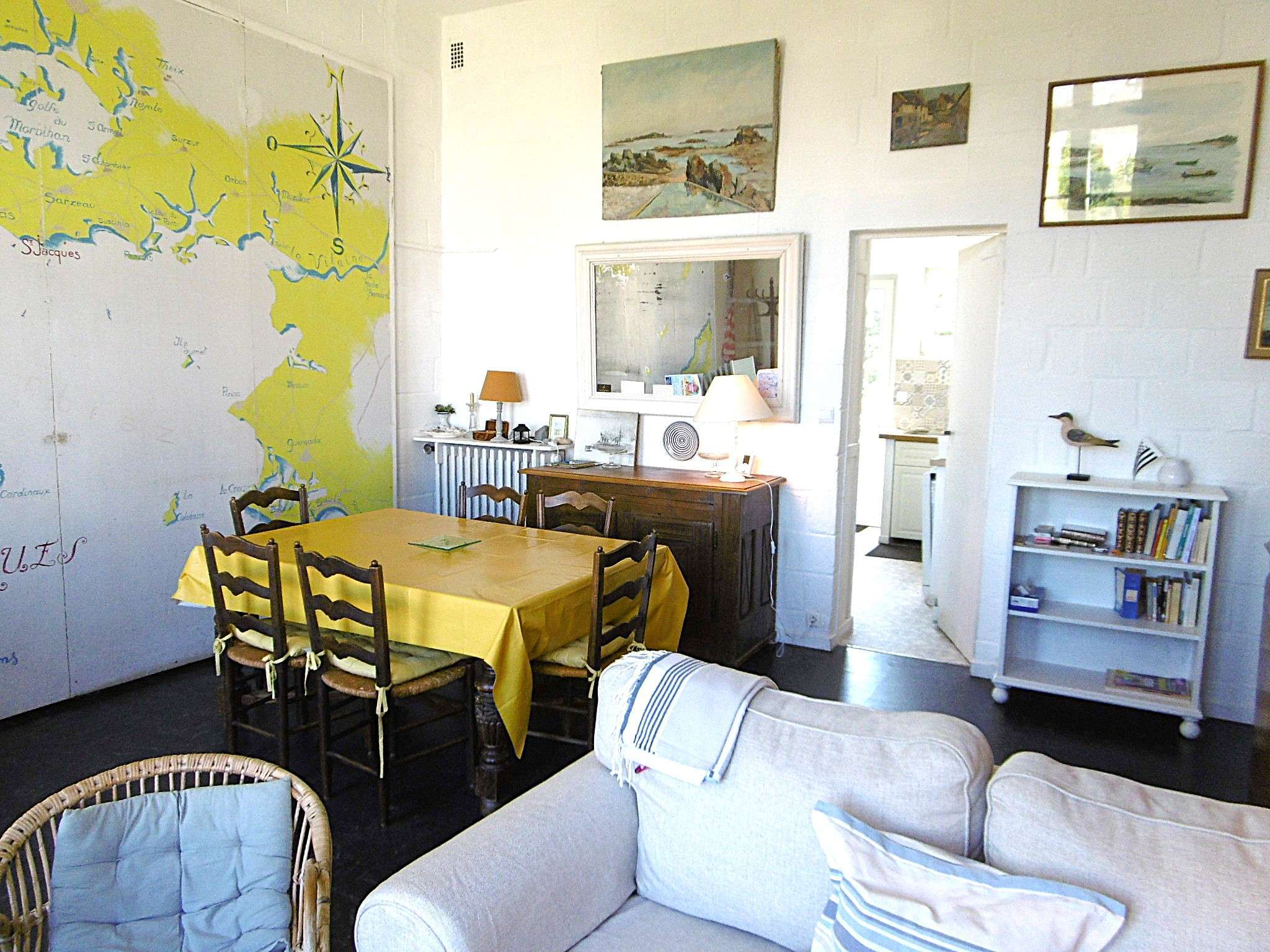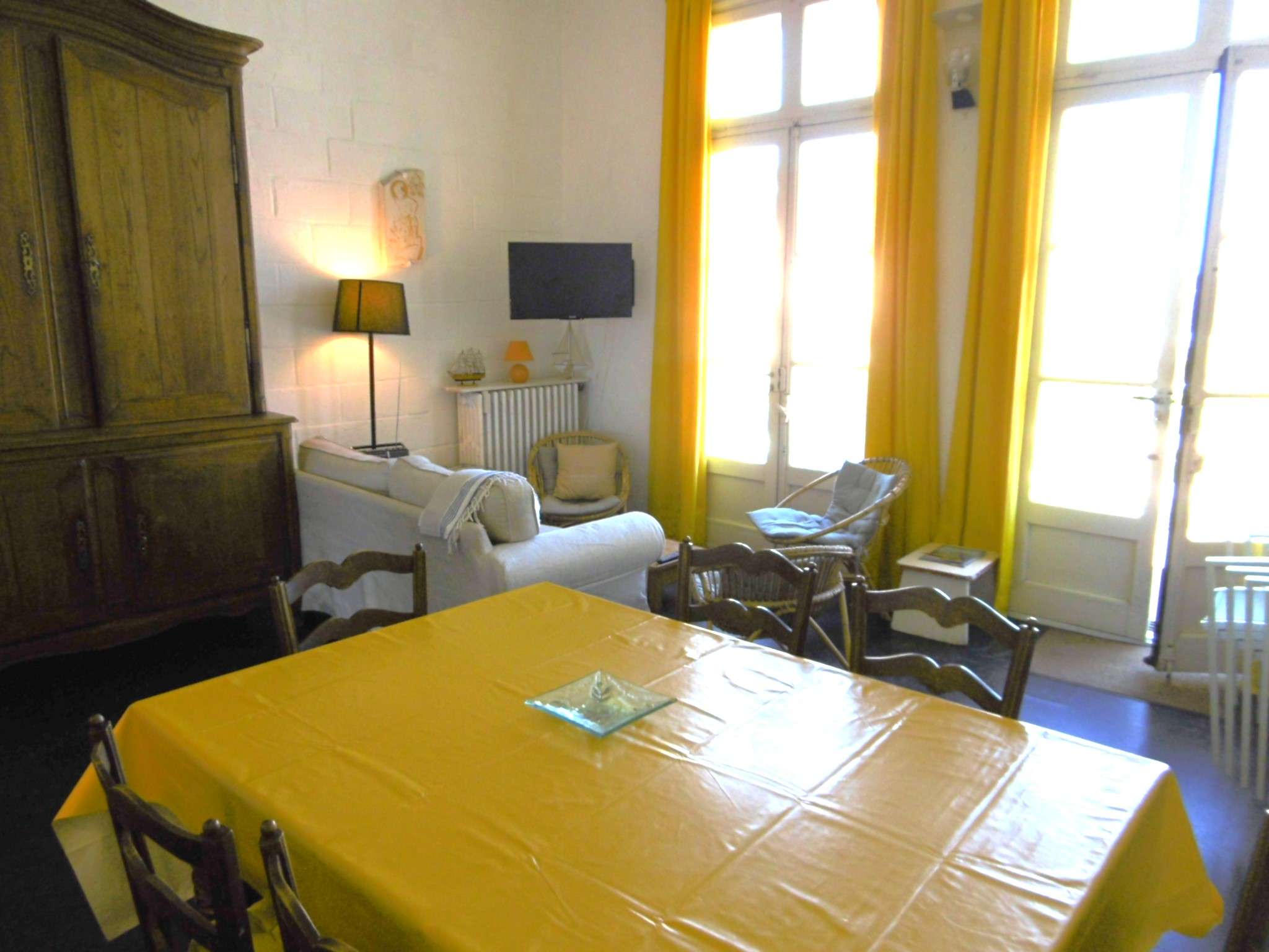 | Séjour Séjour avec 2 portes-fenêtres - - Vue sur le jardin et le port de St Jacques - 1 canapé avec table basse + 2 fauteuils + TV - 1 buffet + 1 armoire - 1 table avec des chaises | 24 | Est |