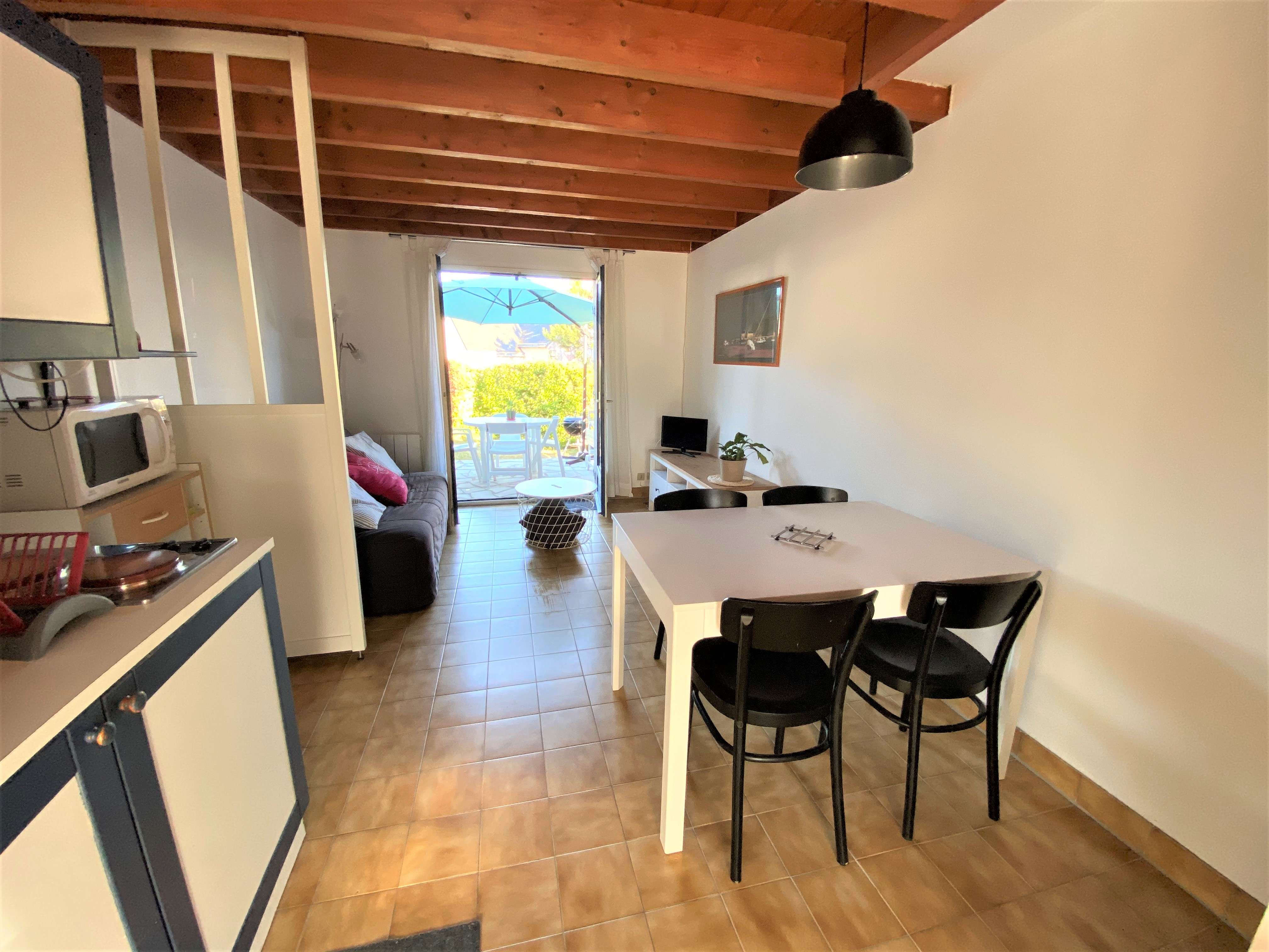 | Séjour /cuisine Séjour avec 1 porte-fenêtre vue sur le jardin : 1 canapé clic-clac en 140, 1 table basse, 1 meuble,1 table + chaise. | 18 | Est |
