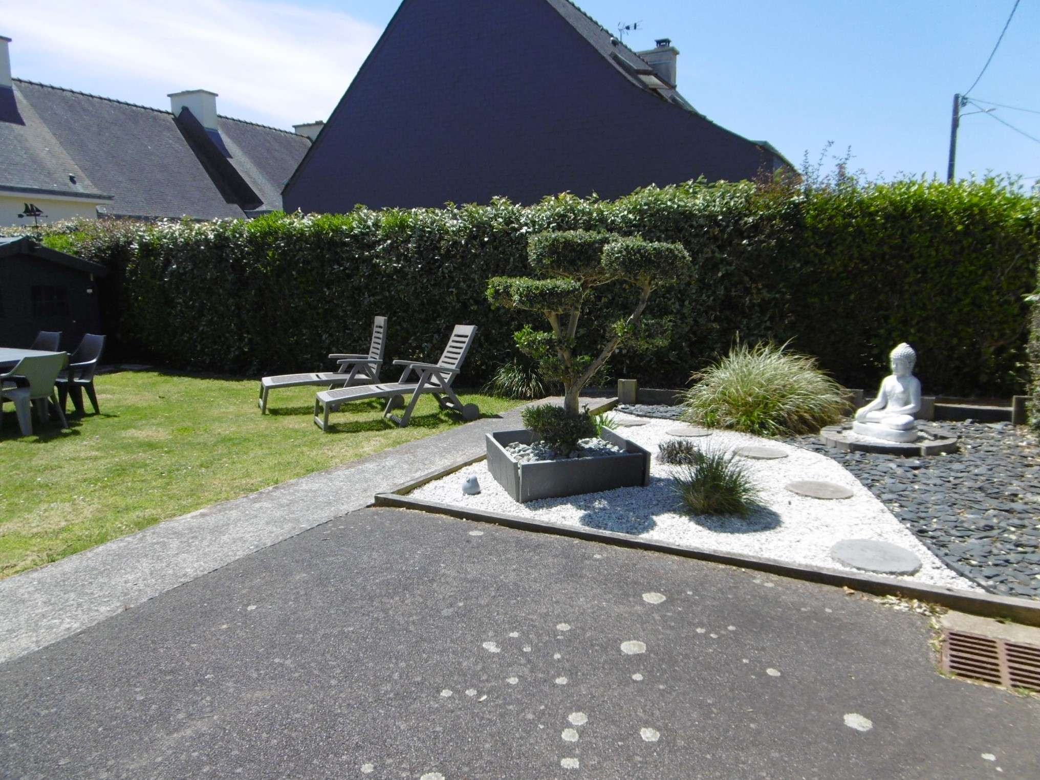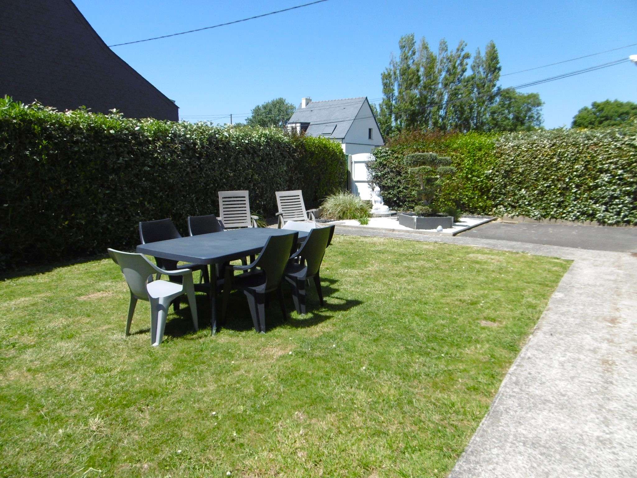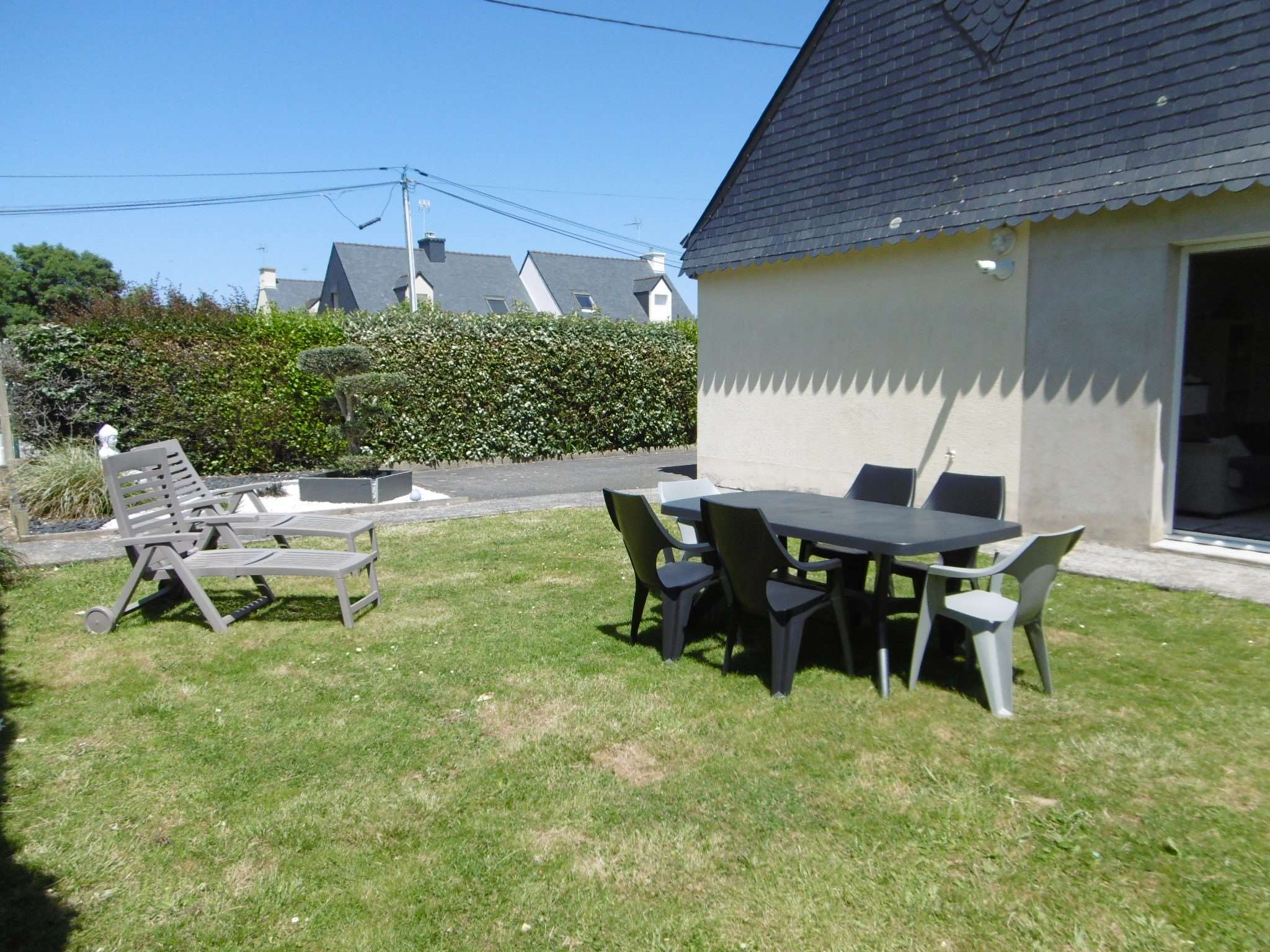 - Un jardin clos équipé d'un salon de jardin, de transats et d'un barbecue (charbon)