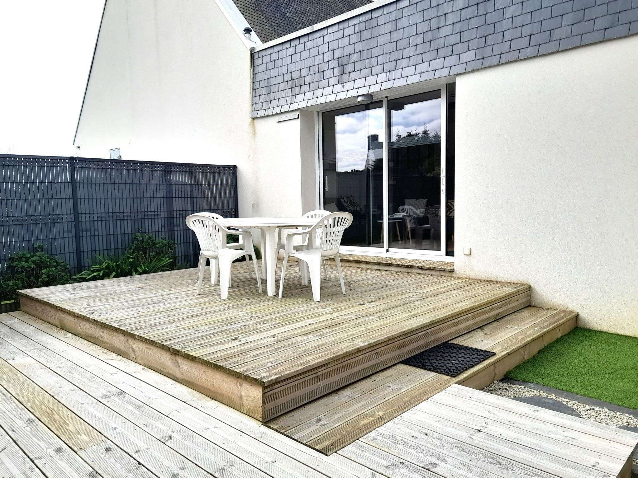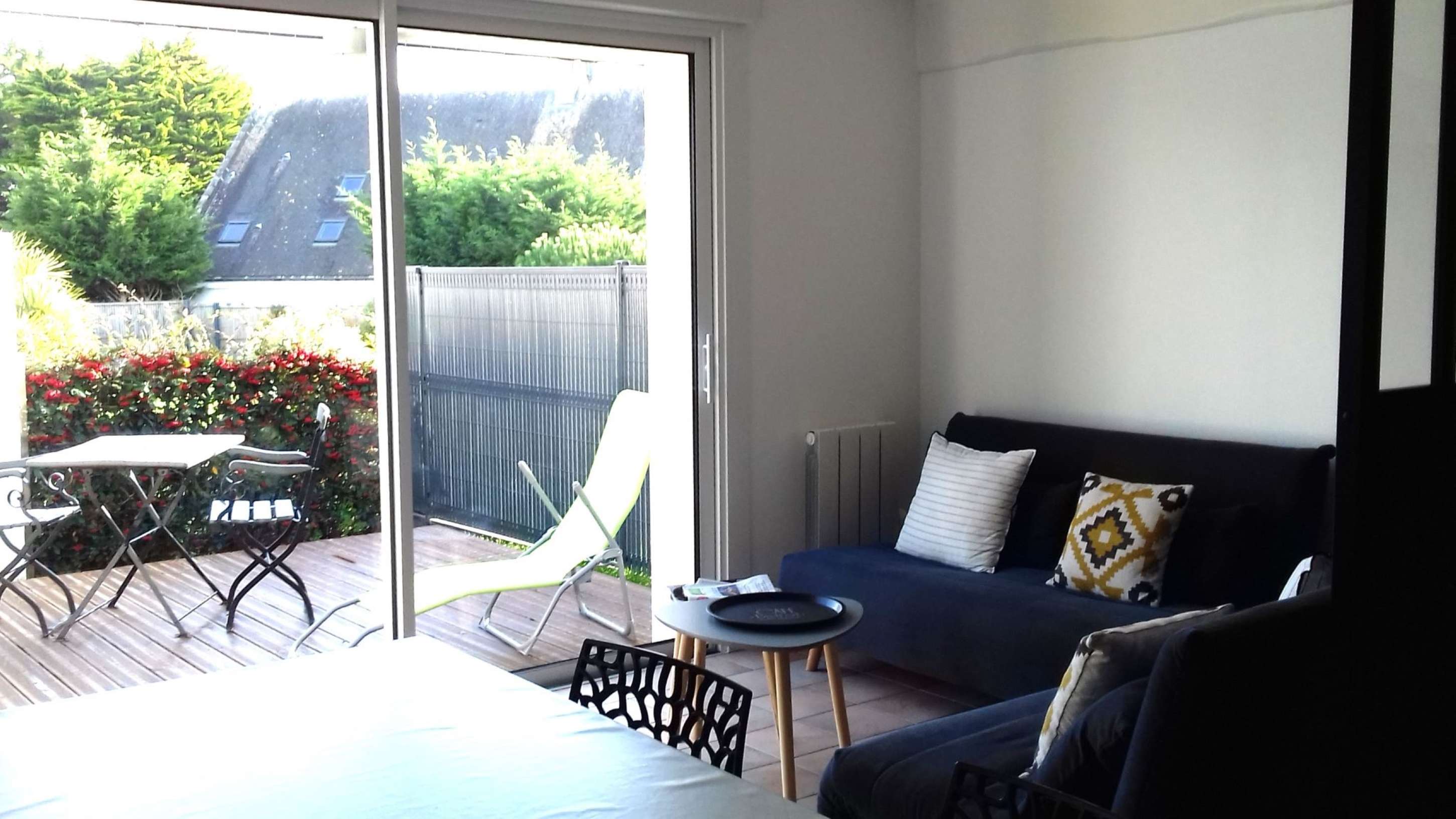 - Un jardin clos avec une terrasse équipée d'un store électrique, d'un salon de jardin, de transats et d'un barbecue au charbon.