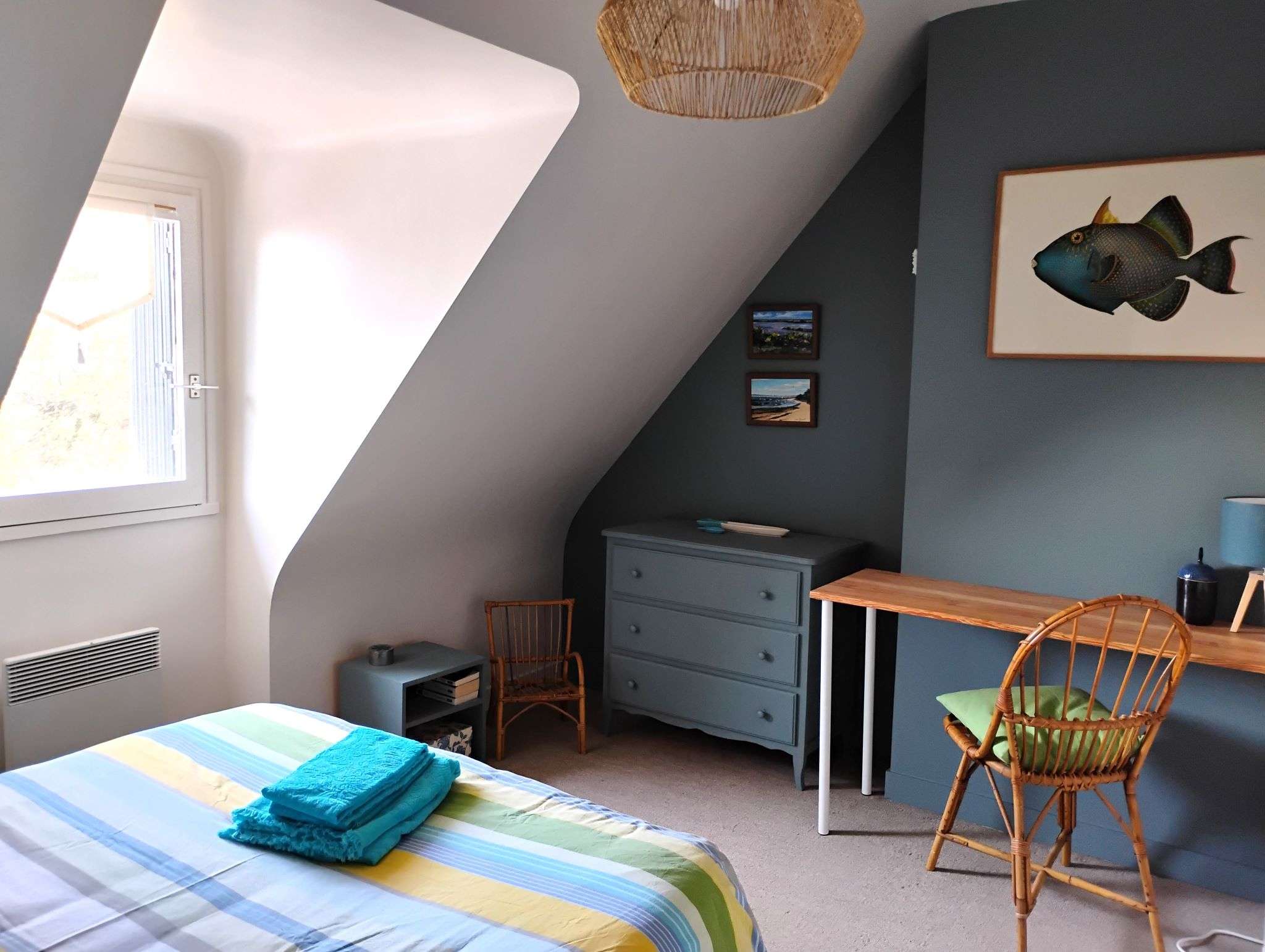 - Chambre 4 : 2 lits simple en 80 + 1 lit d'enfant, penderie