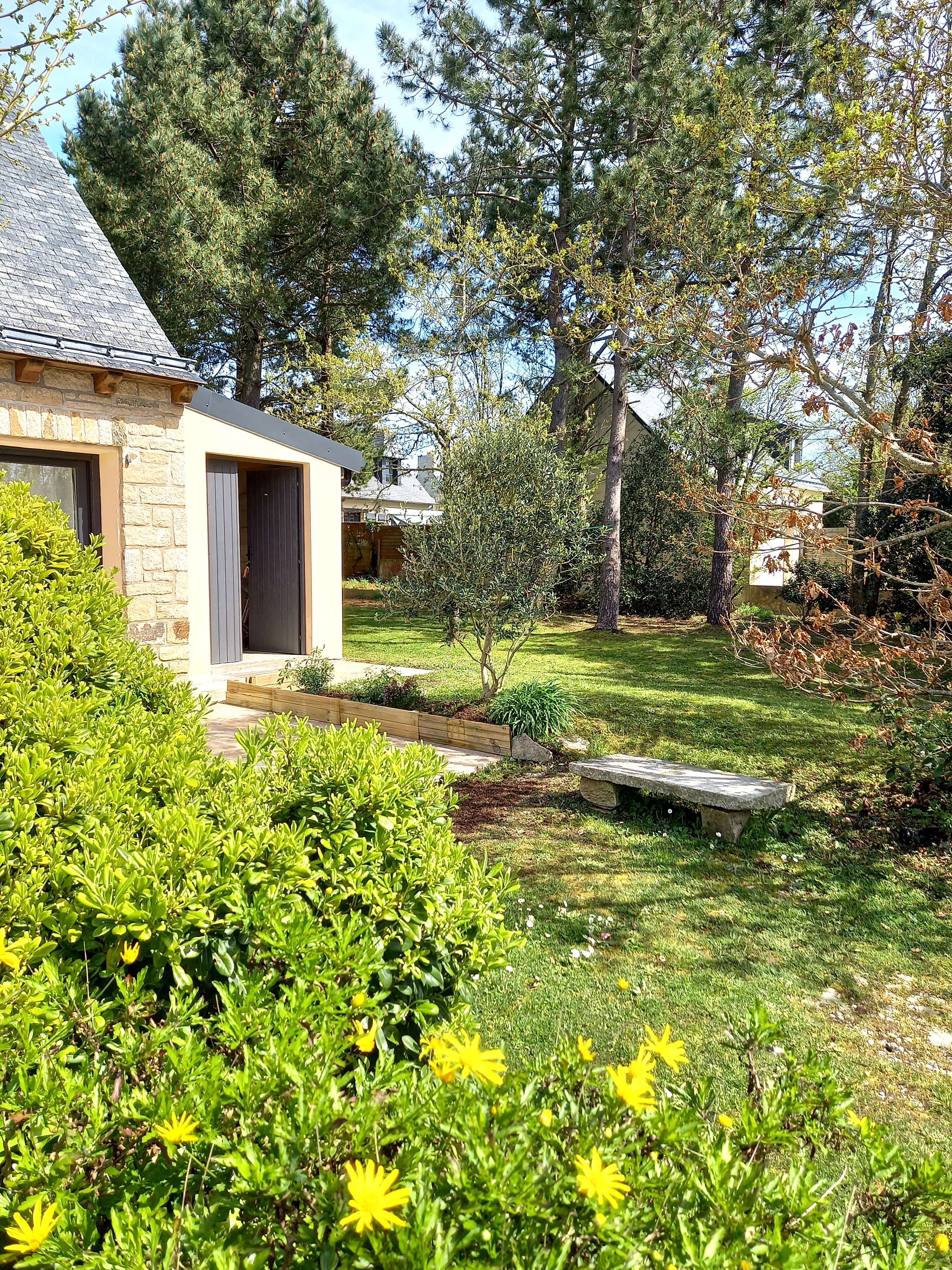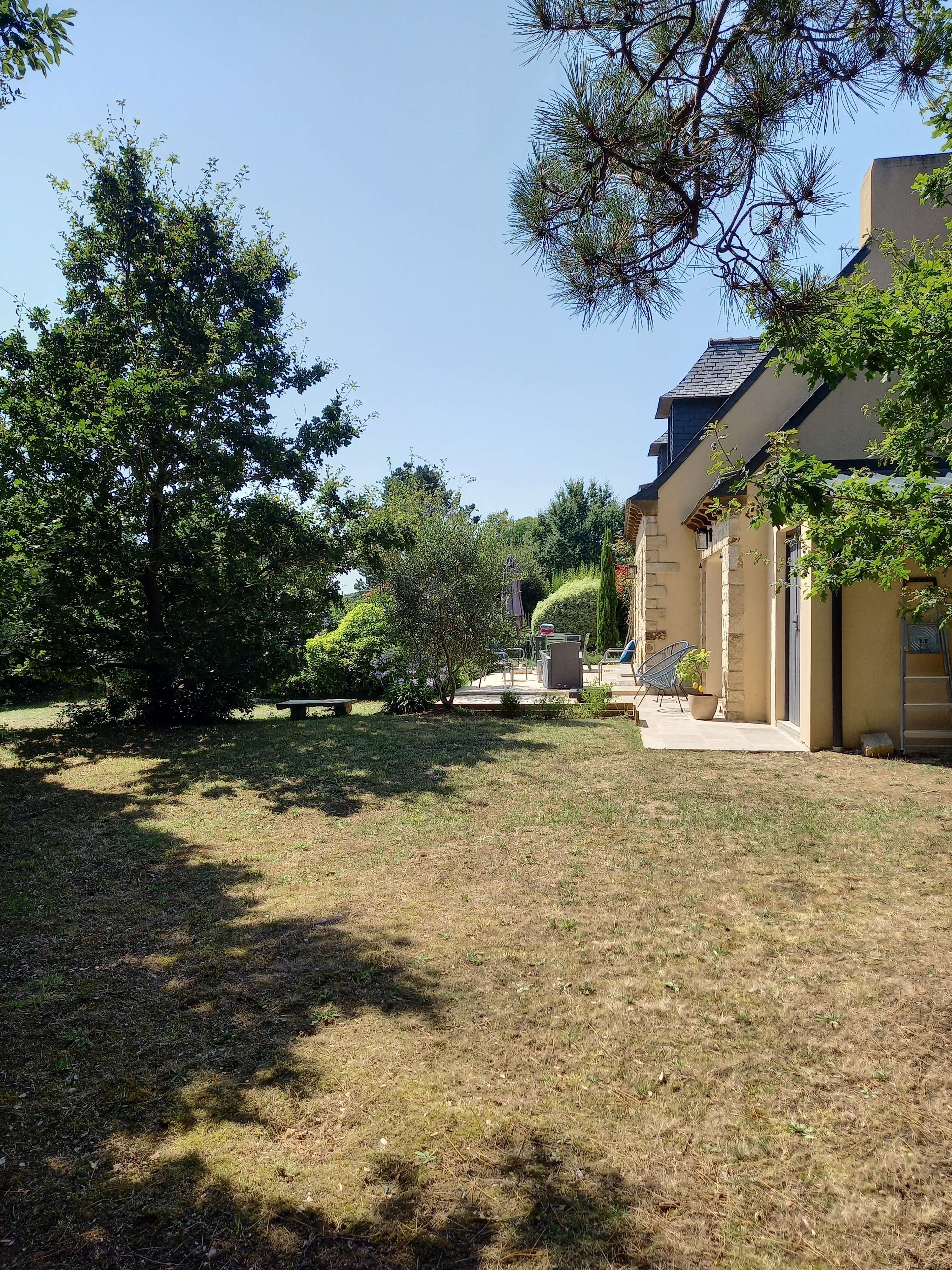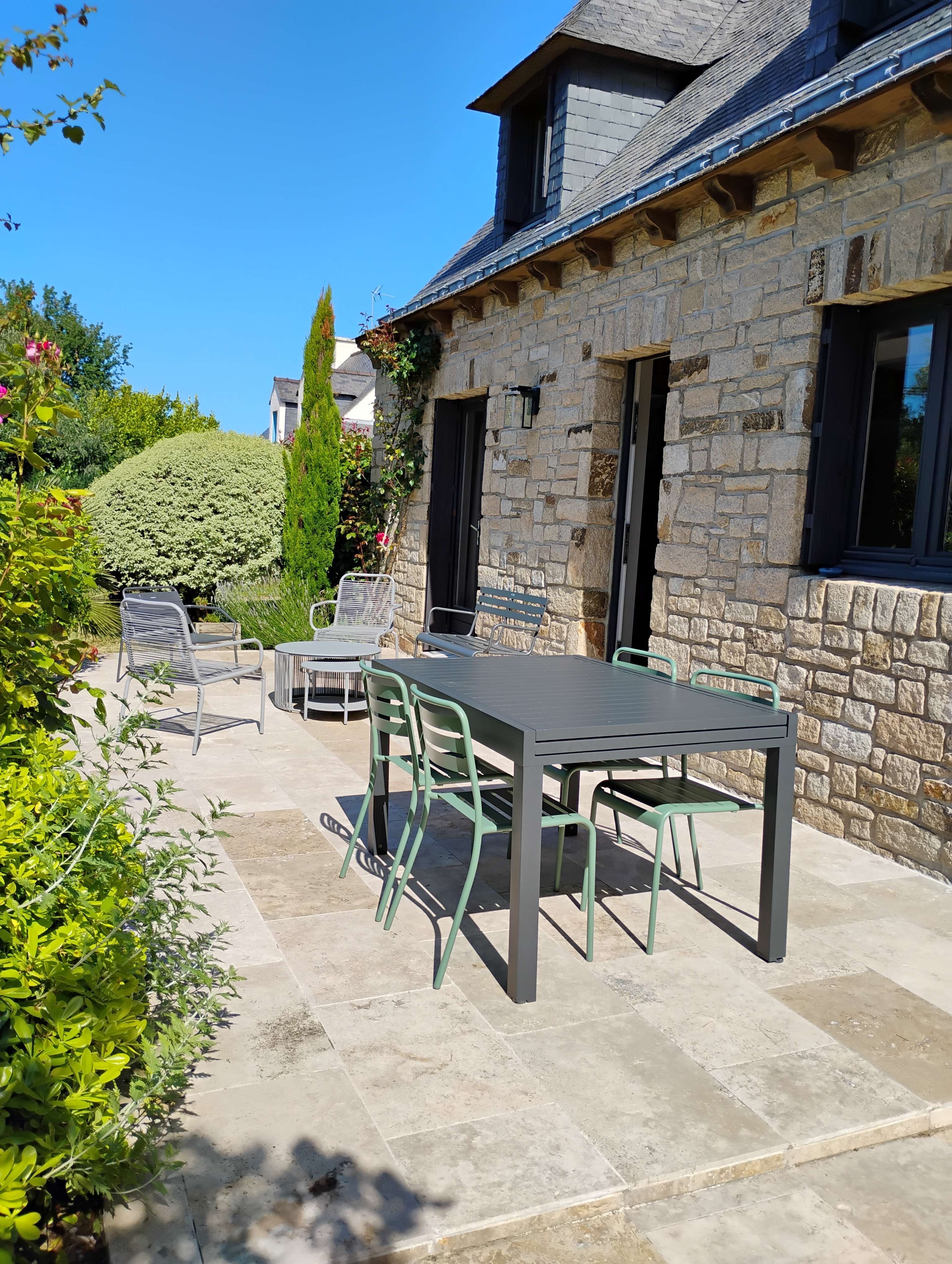 - Jardin non clos avec terrasse équipée d'un salon de jardin, de transats et barbecue.