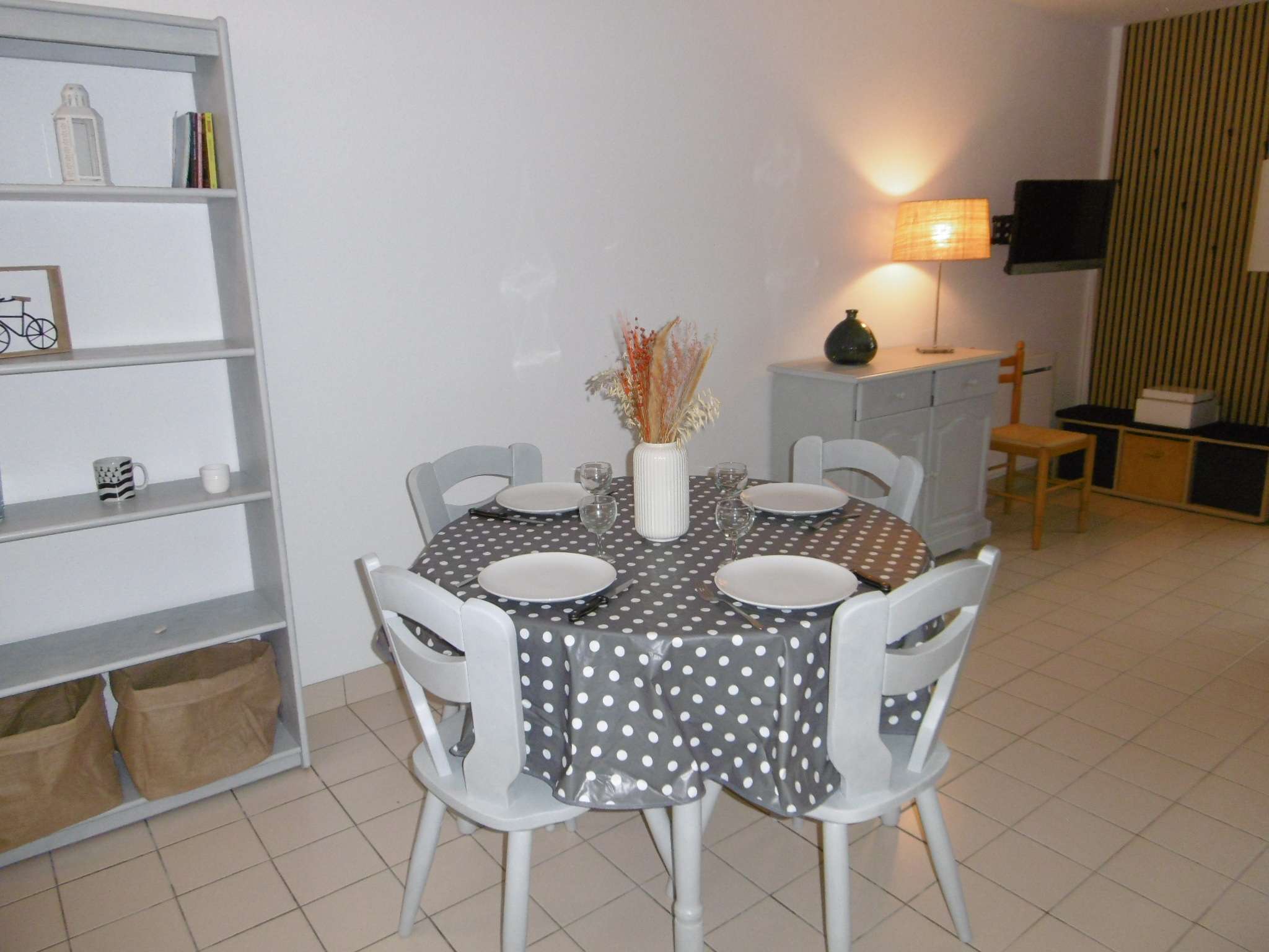 Equipement : réfrigérateur, four électrique, 3 plaques à induction, lave-linge, cafetière, grille-pain, TV.