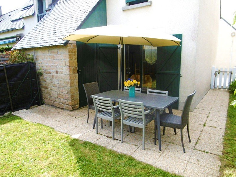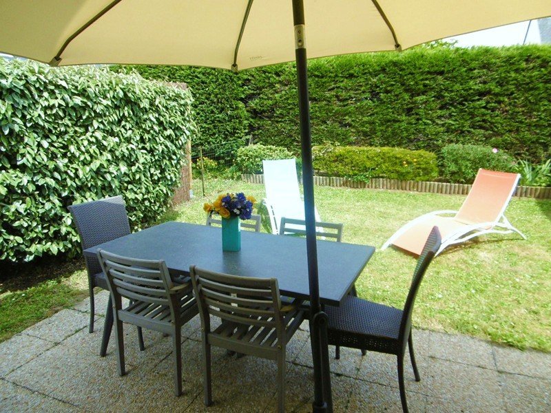 - Un petit jardin clos avec une terrasse équipée d'un salon de jardin, d'un parasol, de bains de soleil et d'un barbecue.