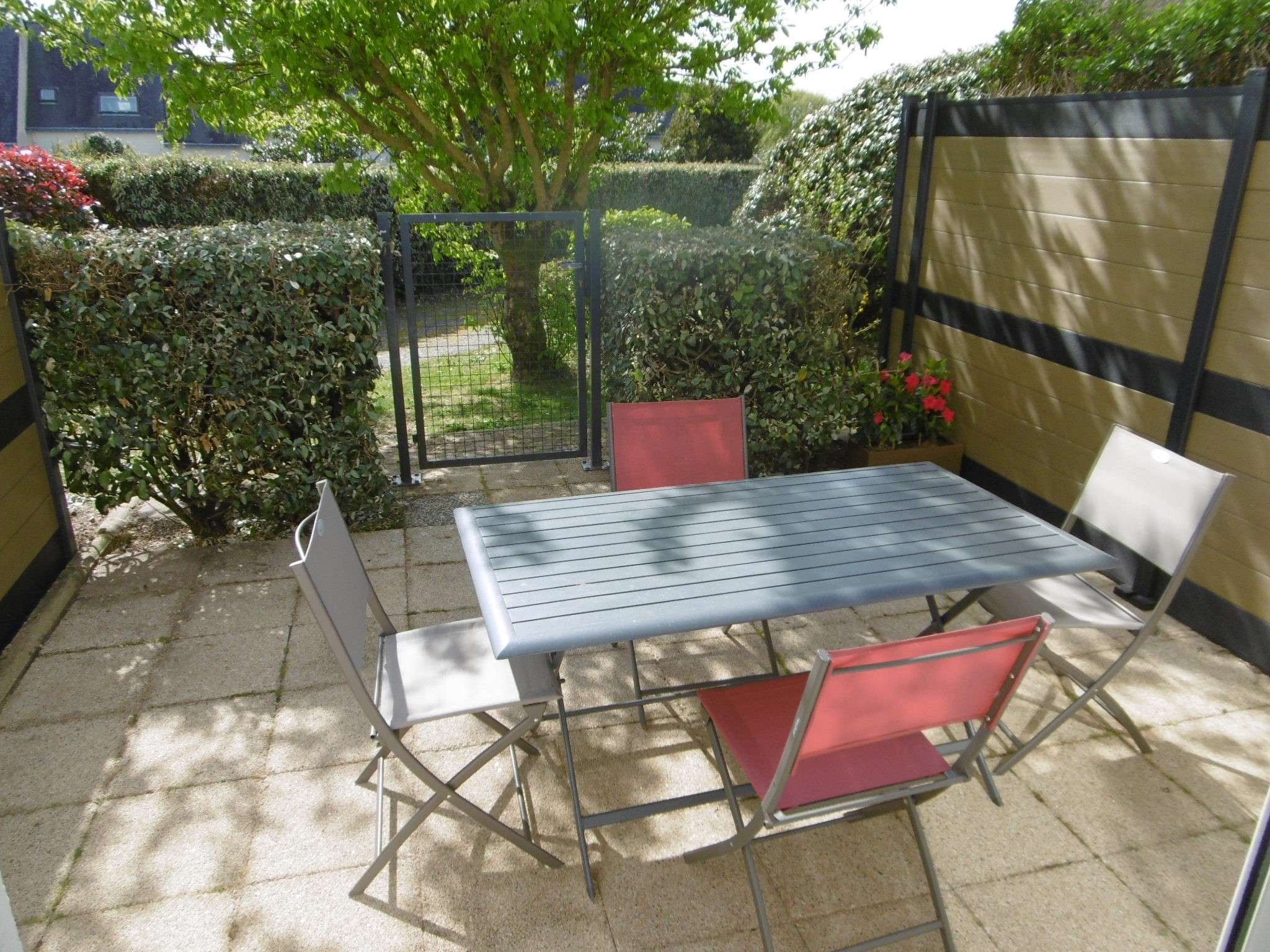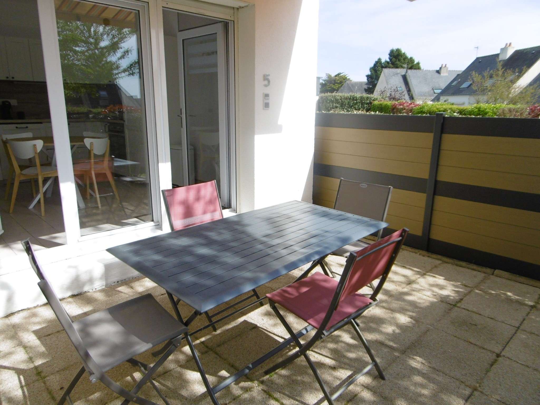 - Petite terrasse close vue sur le parc de la résidence équipée d'une table avec 4 chaises, 2 transats, plancha électrique