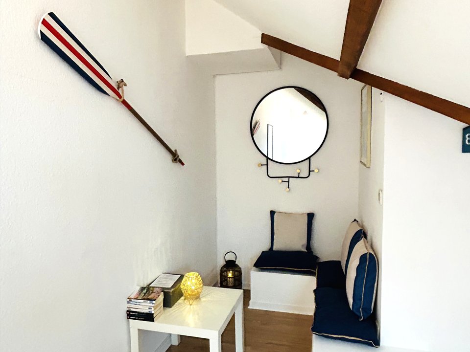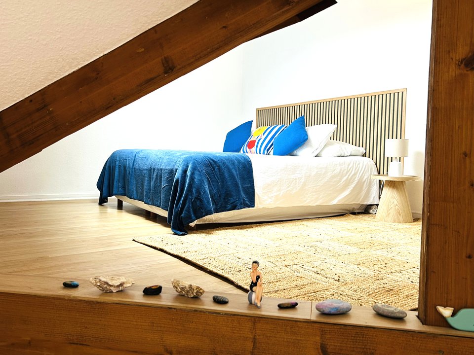 - Un escalier menant à la mezzanine disposant de 2 lits simples 80 cm (possibilité de les réunir en lit double).