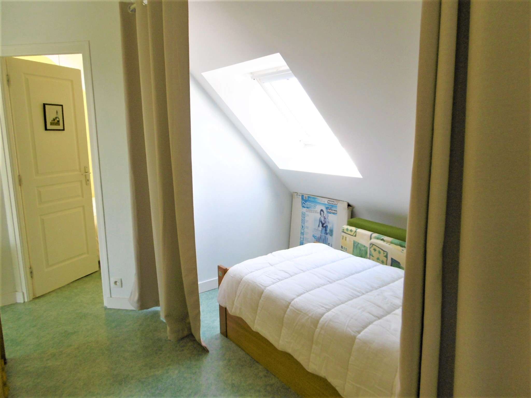 - Une mezzanine fermée par un rideau, avec un lit simple en 90