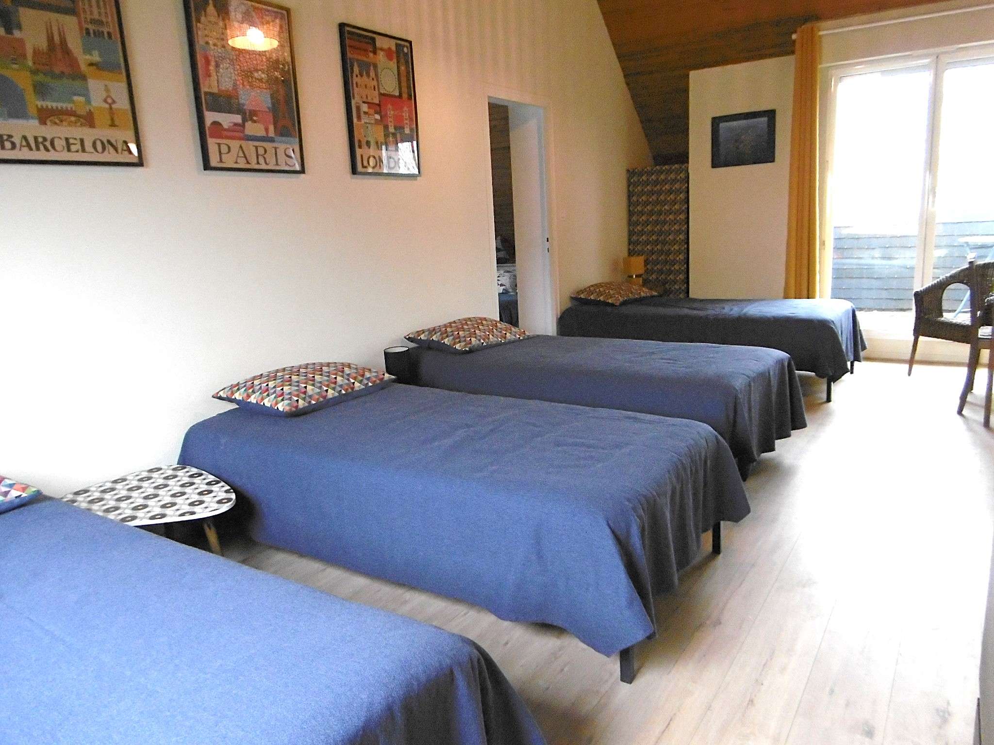 - Chambre 2 (communique avec les chambres 3 et 4) : 4 lits simples en 90 (possibilité de mettre en lit double) et télévision