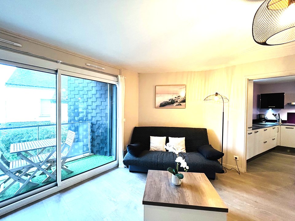 - Un séjour salon vue mer avec cuisine toute équipée ouverte, équipé d'une table et d'un canapé lit